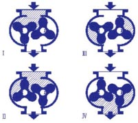 羅茨真空泵具有二個(gè)三葉型轉(zhuǎn)子,通過(guò)一對(duì)同步反向旋轉(zhuǎn)高精度齒輪驅(qū)動(dòng),右圖為轉(zhuǎn)子在泵腔內(nèi)旋轉(zhuǎn)120°,完成一次吸、排氣的過(guò)程。三葉轉(zhuǎn)子采用漸開線型線,轉(zhuǎn)動(dòng)時(shí)互相不接觸并保持恒定間隙??膳c多種前級(jí)泵配套,采用風(fēng)冷或水冷方式和多種密封形式,滿足不同工藝和工況要求。