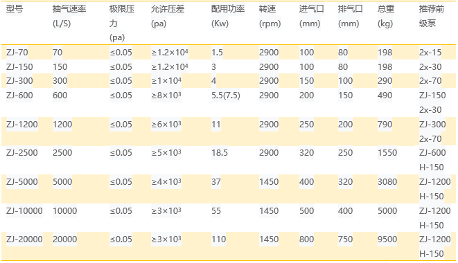 注:上表各性能是在配用推薦前級(jí)泵的條件下獲得的,若視情況選用不同的前級(jí)泵,其主要性能指標(biāo)會(huì)有所變化。抽氣速率系指在配用推薦前級(jí)泵的條件下,羅茨真空泵的入口壓力在67pa~2.67pa范圍內(nèi)所測(cè)得的較大抽氣速率。(見(jiàn)性能曲線)0壓力系指在配用推薦前級(jí)泵的條件下,不帶任何附加容器、泵口密閉不進(jìn)氣,經(jīng)過(guò)充分抽氣后用壓縮式真空計(jì)在泵進(jìn)氣口處測(cè)得的穩(wěn)定的空氣分壓力的較低值。