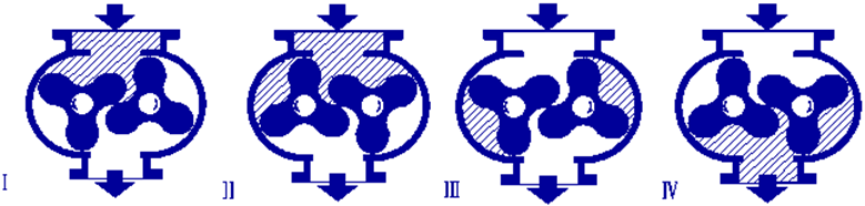 ERG型羅茨鼓風(fēng)機和ERP型羅茨真空泵均是一種旋轉(zhuǎn)式容積機械泵。二個三葉型轉(zhuǎn)子與機體保持一定的間隙,通過一對同步反向旋轉(zhuǎn)高精度齒輪使二個轉(zhuǎn)子在機體內(nèi)旋轉(zhuǎn)時互相不接觸并保持一定間隙。下圖為風(fēng)機的結(jié)構(gòu)原理圖,從圖Ⅰ至Ⅳ為轉(zhuǎn)子在機體內(nèi)旋轉(zhuǎn)并完成一次吸、排氣的過程。二個三葉轉(zhuǎn)子在機體內(nèi)旋轉(zhuǎn)一周均完成三次吸氣、排氣。